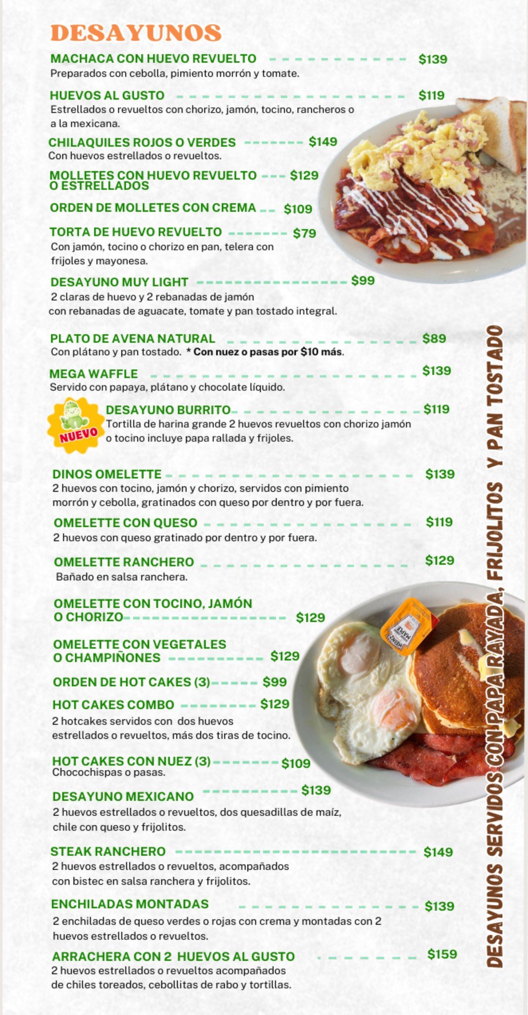 Chilaquiles rojos o verdes, Molletes, Omelettes, Sopa Azteca, Fajitas de Arrachera, Tacos dorados, Tacos de Bistec, Pechuga empanizada, Ensaladas, filetes de pescado o de camarón, entre muchos platillos mas.