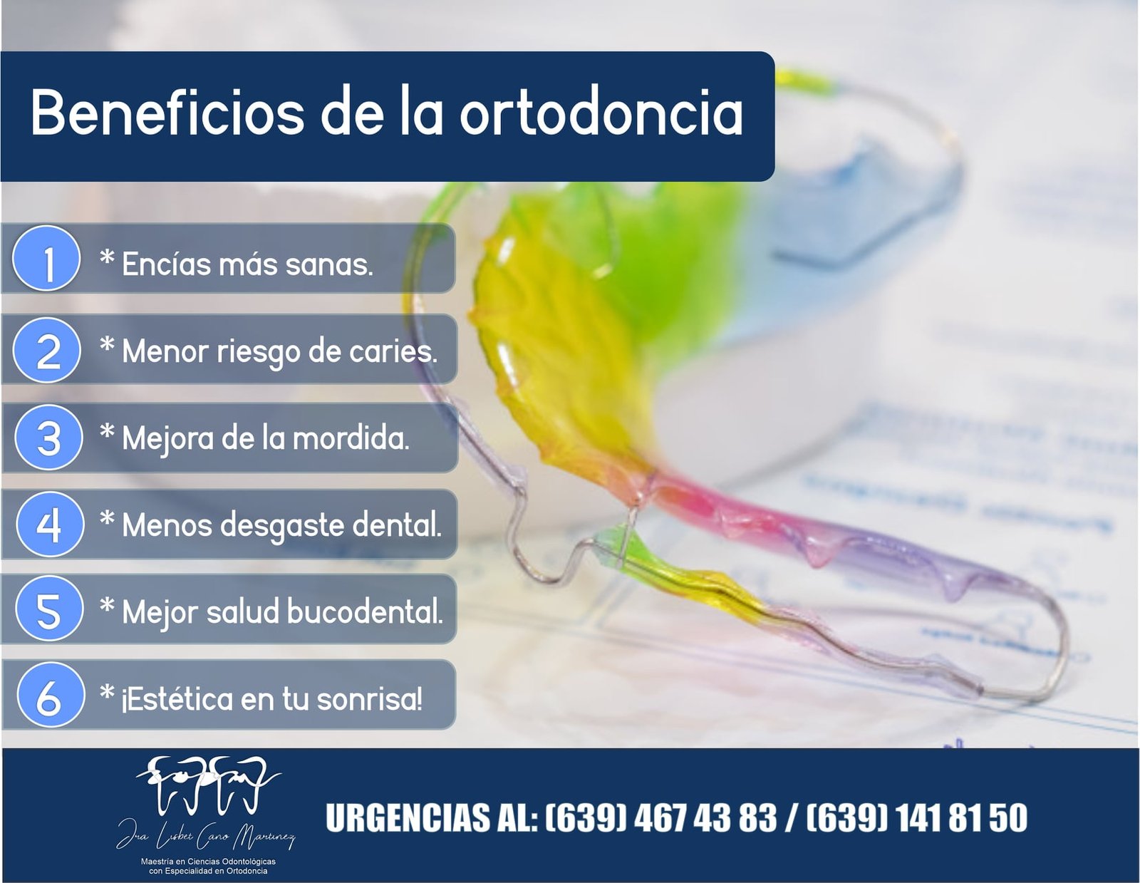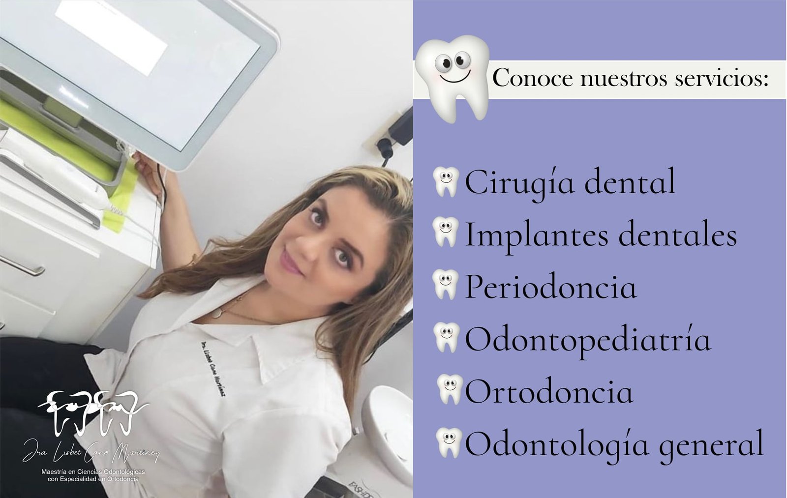 La Dra. Lisbet Cano Martinez, Ortodoncista y especialista en Brackets en Delicias maneja una clínica dental familiar donde queremos verte feliz, por ello contamos con diferentes tratamientos que se adaptan perfecto a tus necesidades, estilo de vida y presupuesto, como: Brackets, retenedores, Limpieza dental, carrillas dentales, blanqueamiento dental, extracciones, relleno dental, prótesis dental, endodoncia, implantes dentales, periodoncia entre otros.